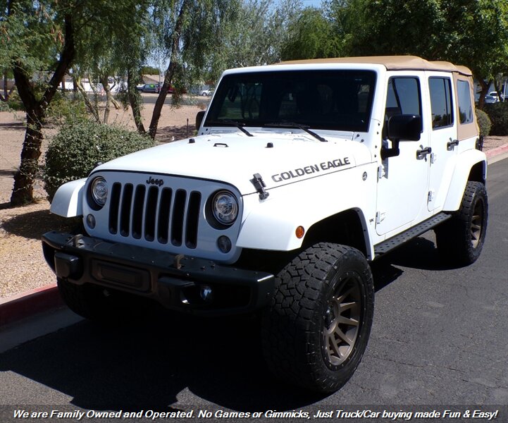 Check out this LOW Mile 2018 Jeep Wrangler Unlimited Golden Eagle in White! Clean Carfax & LOW Miles! Well Maintained and Serviced Wrangler! Super Clean Golden Eagle Edition! Fully Loaded and Ready to GO! Financing options available for all types of credit! Deal with some of the best banks in the Auto Industry! Trades Always Welcomed! We also offer up a great variety of warranties to fit your car needs and keep you protected. Want to be pre-approved before you head down? Easy online credit apps and complete inventory with additional pictures can be viewed at www.goodcaraz.com if you want to shop from home or just give us call (480) 890-5752. We are Family Owned and Operated. Never any games or gimmicks, just car & truck buying made easy and fun. Come on down and check us out.